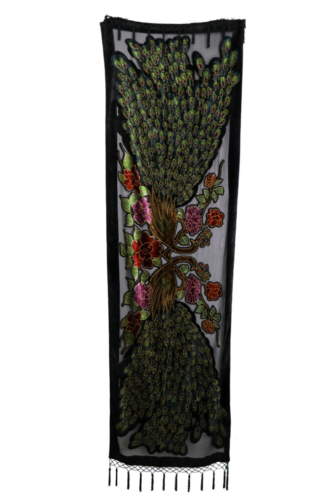 Burnt-out Velvet Beaded Oblong Peacock Scarf w/beaded tassel – Black
